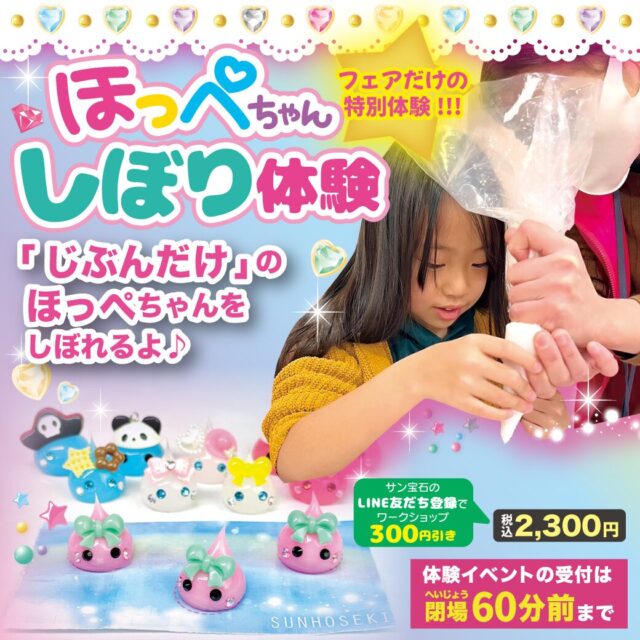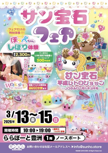 サン宝石フェア|2026年3月13日(金)〜3月15日(日)ららぽーと豊洲1でほっぺちゃんワークショップ開催!