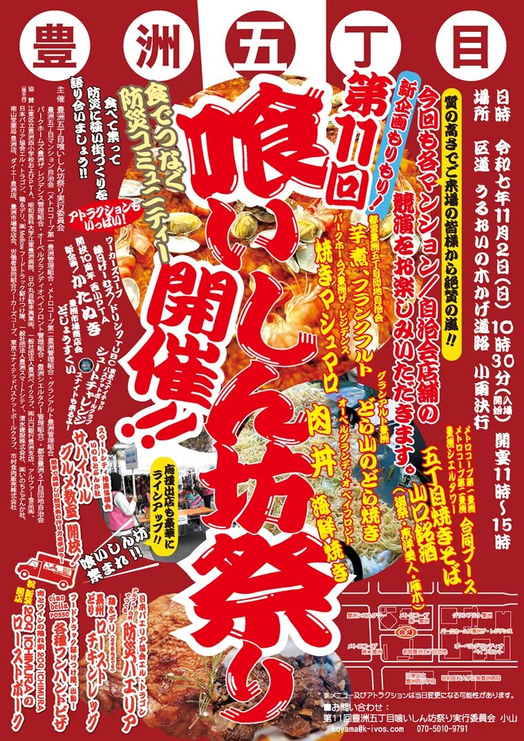 豊洲の街を丸ごと楽しむ秋恒例のグルメイベント「第11回豊洲五丁目喰いしん坊祭り」が、今年も開催されます。地元のマンションや自治会、飲食店が協力し、焼きマシュマロや芋煮、フランクフルト、肉丼、海鮮焼きなど多彩なグルメが登場。豊洲ならではの温かな雰囲気の中で、地域交流と防災の輪を広げる手づくりイベントです。子ども向けアトラクションや縁日、ワークショップも盛りだくさんで、家族みんなが笑顔になれる秋の一日を楽しめます。